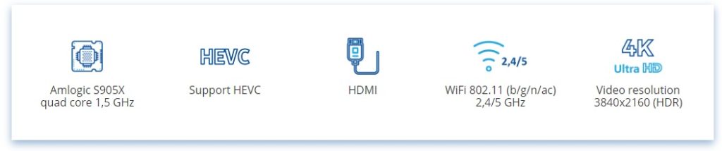 HDMI, AV, Ethernet, 2xUSB, MicroSD Card, ext.IR, Wi-Fi 802.11